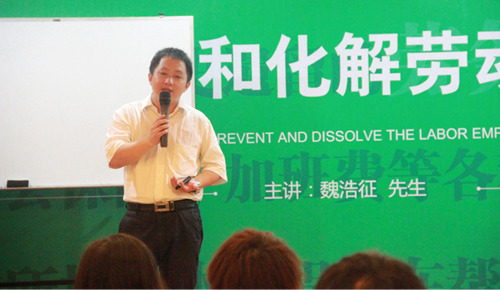 随着《中华人民共和国劳动合同法》、《劳动合同法实施条例》、《劳动仲裁法》的相继出台,劳动者的维权意识增强,诉讼成本极大降低,越来越多的企业深陷劳动争议之泥潭不能自拔。虽然多数企业已对传统的用工理念和模式进行了调整,但部分历史遗留的劳务派遣、工伤、劳动合同、社会保险、加班费等各种劳资纠纷问题让企业不知所措。2014年8月23日,由新安人才网企业管理咨询中心举办的《有效预防和化解劳动用工风险》公开课在新文采会展酒店开课,来自各个企业的40多名学员参加了此次课程。本课程特邀法学硕士,劳动法世界创始人,著名劳动法与员工关系专家魏老师为大家授课。魏老师从“员工关系管理新变化与企业管理新挑战”出发,引出五大用工模式以及劳务派遣、人事外包策略与法律风险控制等,通过一系列的案例逐一讲解,学员们坦言获益匪浅。